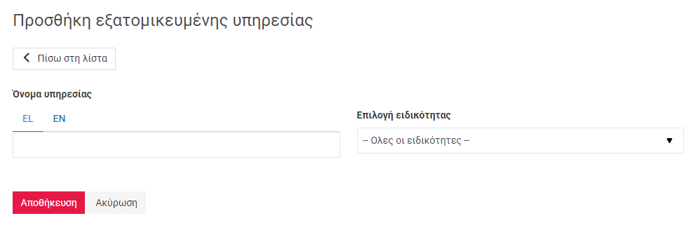 - Εκεί προσθέστε το όνομα της υπηρεσίας και επιλέξτε την αντίστοιχη ειδικότητα.