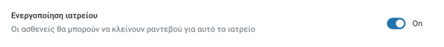 Σε περίπτωση που θέλετε να ενεργοποιήσετε άμεσα το ιατρείο σας και να μπορούν να κλείνουν οι ασθενείς ραντεβού, πατάτε το κουμπί δεξιά από το “Ενεργοποίηση ιατρείου” ώστε να γράφει την ένδειξη “On”, και να φαίνεται όπως στην παρακάτω εικόνα.