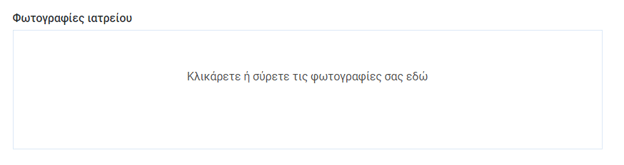 Επιπλέον έχετε την δυνατότητα να προσθέσετε φωτογραφίες για το ιατρείο σας. Μπορείτε να σύρετε κάποια φωτογραφία ή να πατήσετε πάνω στο παρακάτω πλαίσιο και να την επιλέξετε από τον υπολογιστή σας.