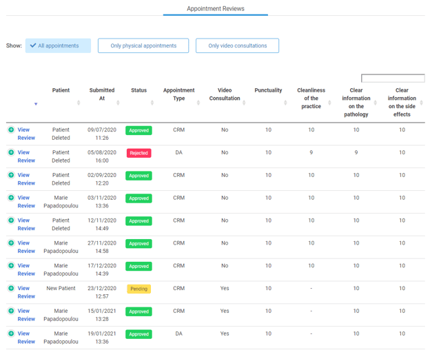 - in the first section, called Appointment reviews, you can filter your appointments by all appointments, only face-to-face appointments or only Video Consultations. This way you’ll be able to make a more specific follow-up of your reviews.