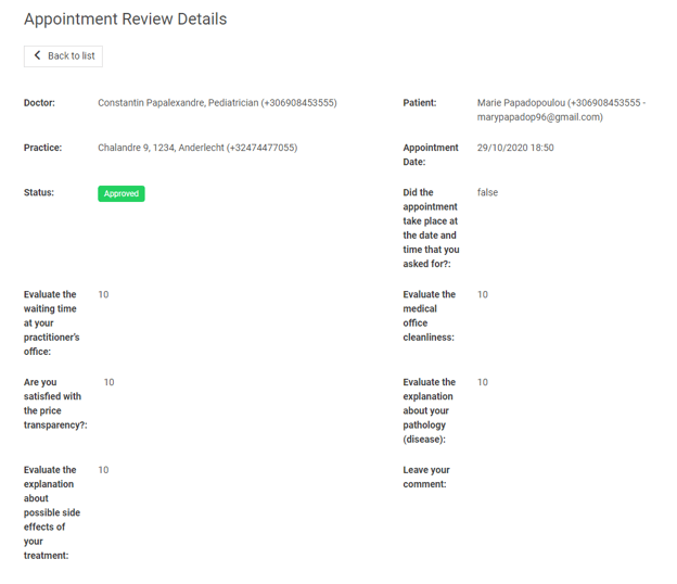 To see the details of a review click on View review and you will be able to find the patient's information, the series of questions they answered and the comments they left about you.