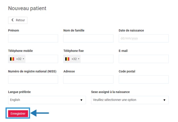 3. Vous serez ensuite dirigé vers la page Nouveau patient pour remplir les informations. N’oubliez pas d’enregistrer lorsque vous avez terminé.