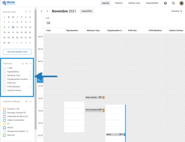 - Vos cabinets : vous pouvez modifier la vue de votre agenda Doctoranytime en fonction du cabinet sélectionné. Par exemple, si vous exercez dans un cabinet spécifique chaque jeudi et que vous ne souhaitez voir que les rendez-vous de ce jour précis, vous pouvez sélectionner cette vue. Cela s'applique également à l’option de rendez-vous en Vidéo Consultation.