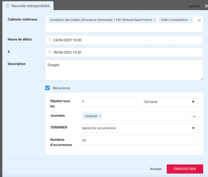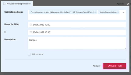 Une fenêtre de nouveau rendez-vous s’ouvre. Sélectionnez le deuxième onglet “Nouvelle indisponibilité”. Il vous suffit de vérifier la date et l’heure de début et de fin et les cabinets concernés par la fermeture.