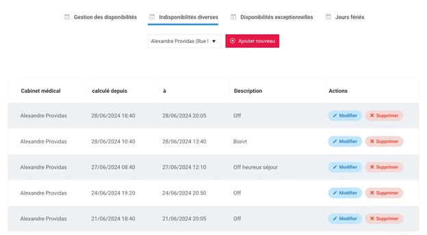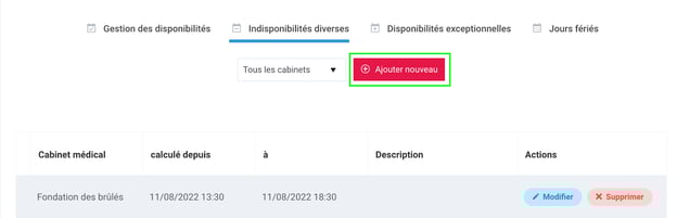 Pour ajouter une nouvelle indisponibilité : Cliquez sur le bouton rouge Ajouter nouveau.