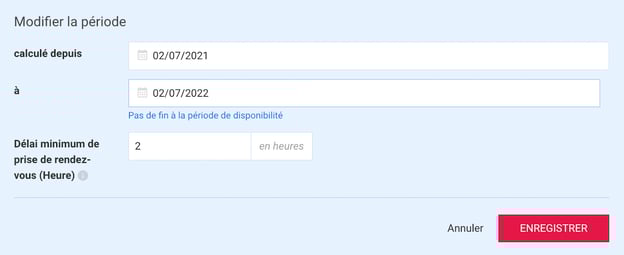 En ajoutant une date de fin à votre période de disponibilité, vous pouvez créer d'autres périodes qui prendront effet dans l'avenir, par exemple à la date de fin de votre première période.