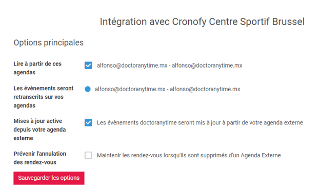 Sélectionnez les calendriers concernés ainsi que ceux dans lesquels les événements de Doctoranytime seront retranscrits.