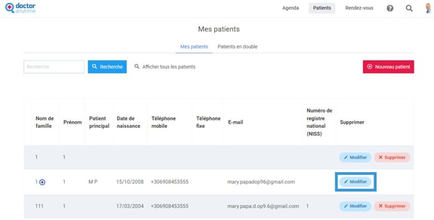 - Allez sur le patient souhaité et cliquez sur le bouton Modifier en bleu pour accéder au dossier du patient.