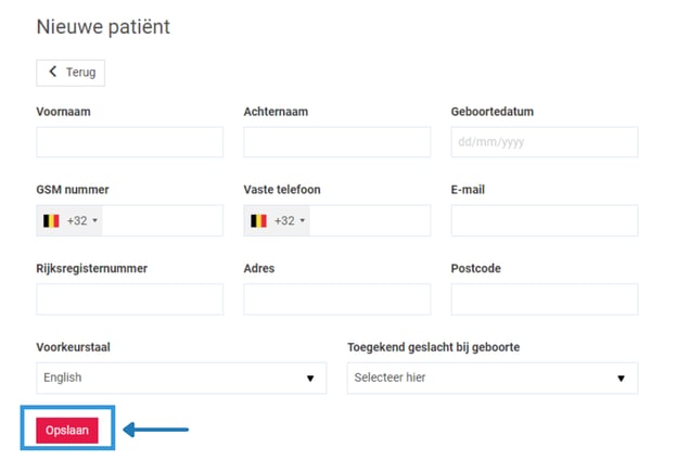 3.   U wordt dan doorverwezen naar de pagina Nieuwe patiënt om alle informatie in te vullen. Vergeet niet op te slaan wanneer u klaar bent.