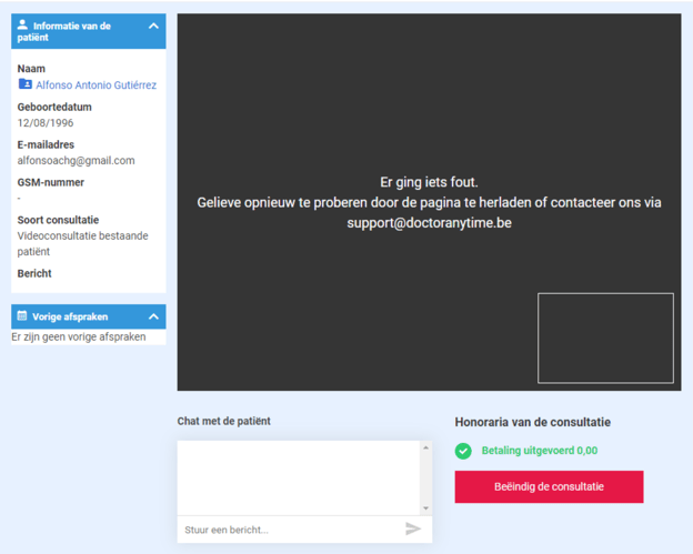 - Als de patiënt de Videoconsultatie verlaat of een probleem met zijn verbinding heeft, geeft het scherm het volgende bericht weer
