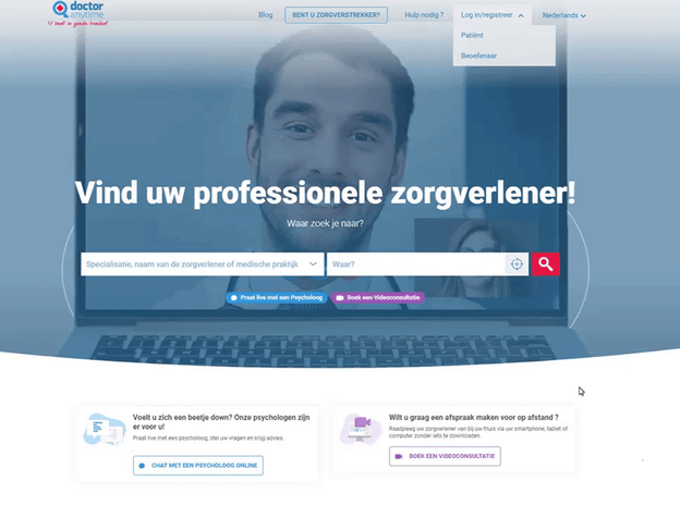 Om toegang te krijgen tot uw account, gaat u naar https://www.doctoranytime.be en klikt u rechtsboven op Log in.
